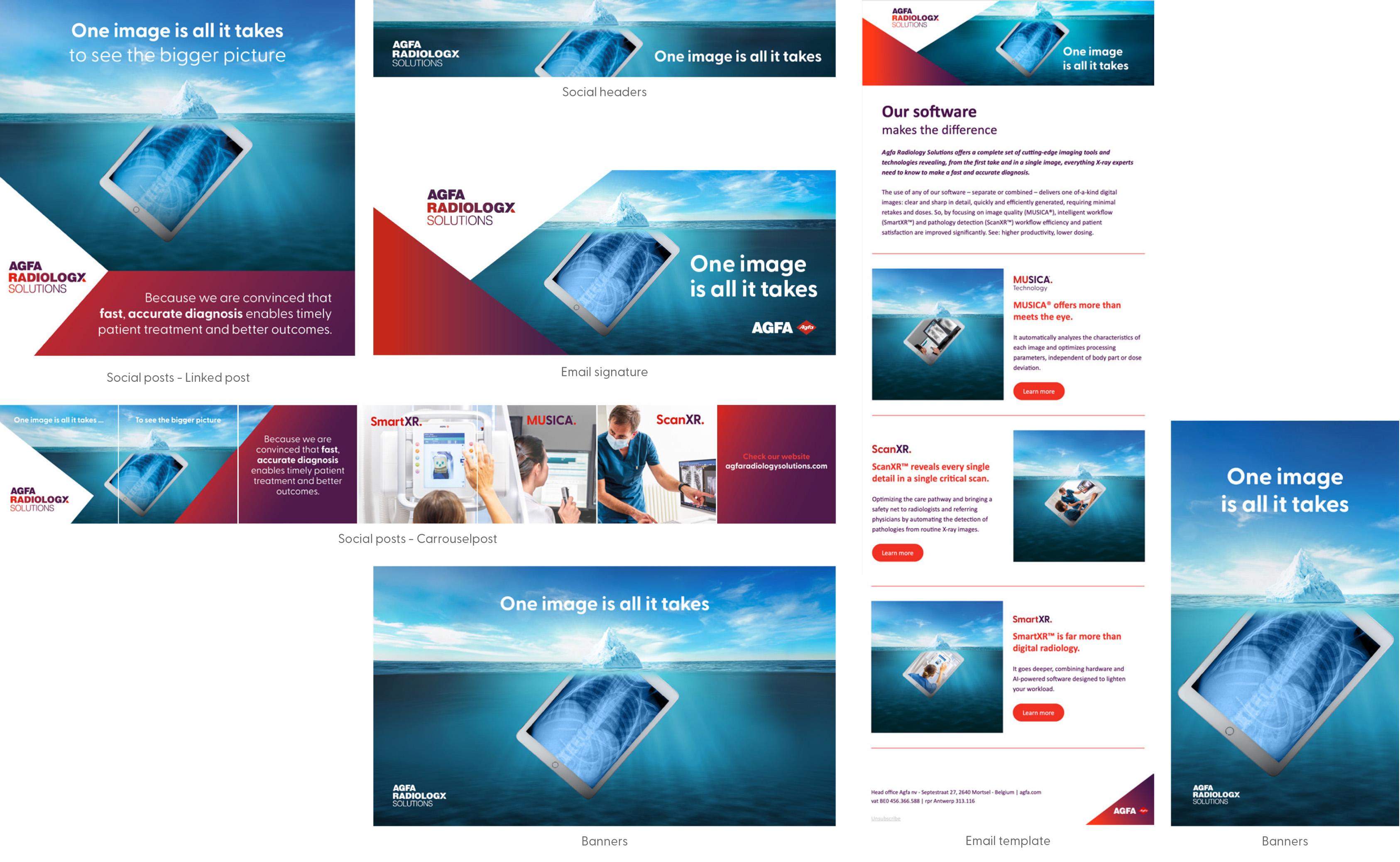Free space: Please give the Agfa Radiology Solutions logo some space to breathe. The height of the capital ‘A’ in ‘AGFA’ is the strict minimum free space on all sides of the logo. Give the logo more space whenever you can.