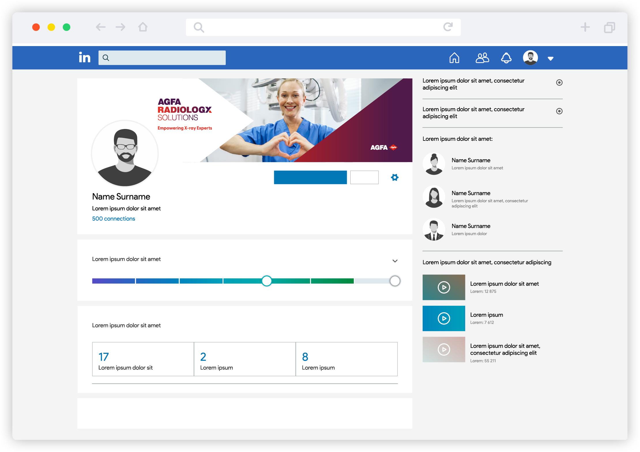Correctly branded profiles on social media enhance our online presence. This example shows you what your LinkedIn profile should look like. You can download header visuals and profile images with the right sizes for LinkedIn, Facebook, Instagram and Twitter.